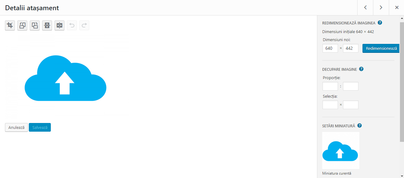 Prima optiune este de a da click pe butonul ‚Editeaza imaginea’ sub previzualizarea imaginii care va deschide editorul de imagini in pop-up. A doua optiune este de a da click pe link-ul ‚Editeaza mai multe detalii’. Dand click pe link-ul de editare al detaliilor imaginii, se va inchide pop-up-ul media si te va duce pe pagina ,Editeaza media’. De aici puteti da click pe butonul ‚Editeaza imaginea’ sub previzualizarea imaginii. Acesta va deschide ecranul pentru editarea imaginii. Vei vedea o bara cu instrumente cu cateva butoane deasupra imaginii tale. Pe coloana din dreapta, vei vedea o gramada de optiuni pentru a redimensiona imaginea.